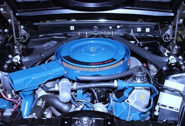 The air cleaner lid is painted blue on a 1969 Shelby and says "COBRA JET RAM AIR".