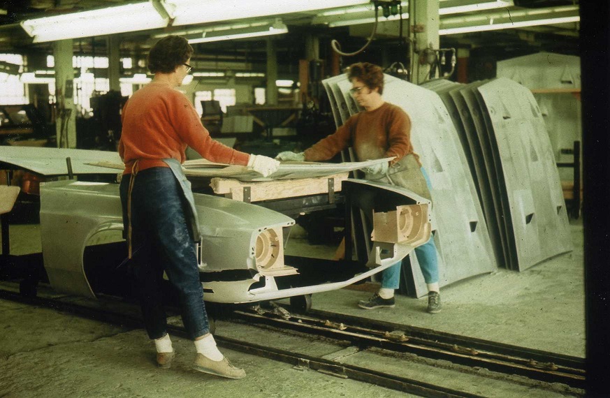 Gloria Spencer in the brown sweater (right) and Vickie Bloomburg lay out a set of front end parts. You can see the pink fiberglass head light buckets.