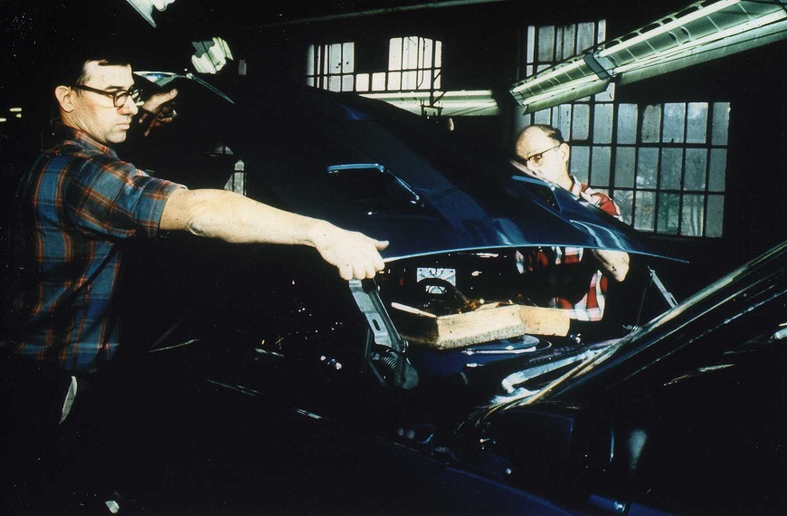 It takes two workers to properly install and adjust the hood. Charlie Droste is on the right. Charlie worked at the plant for 35 years. He started in the 1950s.