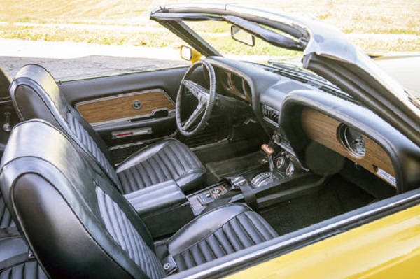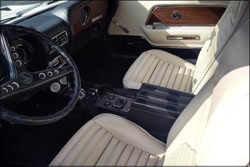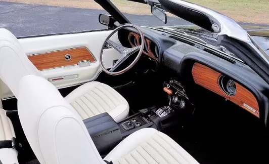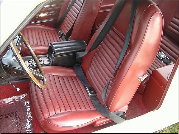 A limited number of red interior cars were produced. I believe all these cars had the walnut style appliques. The carpets are red. They are the Mach 1 style with four sewn inserts. A few cars may