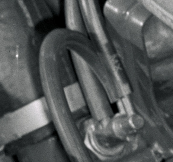The back of the intake manifold has a pedestal that was usually unpainted (top-center). Please note the vacuum fittings lower right. The fitting that screws into the intake manifold is painted. The secondary fitting remains unpainted brass.