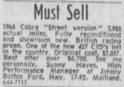 Here are some newspaper ads for some of the Cobras the dealership sold. This one is from the Orlando Sentinel November 1965.
