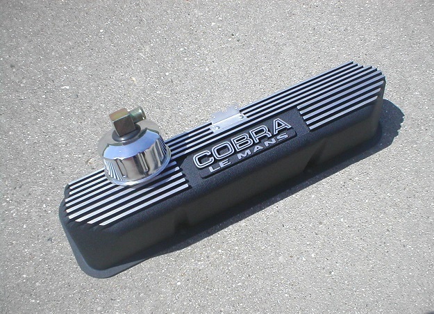 The valve covers are the same used on the GT500 and say "Cobra Lemans". A chrome oil filler cap with a metal fitting is used.