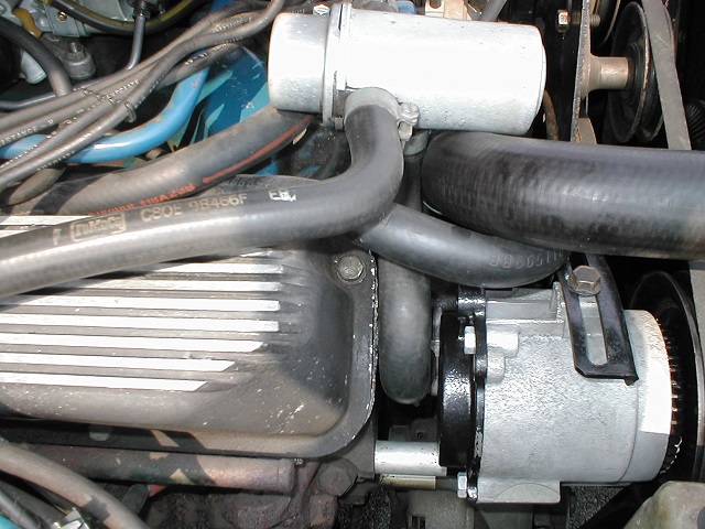 The water pump bypass hose is actually thicker than regular heater hose. It was painted blue with the engine assembly and tower clamps.