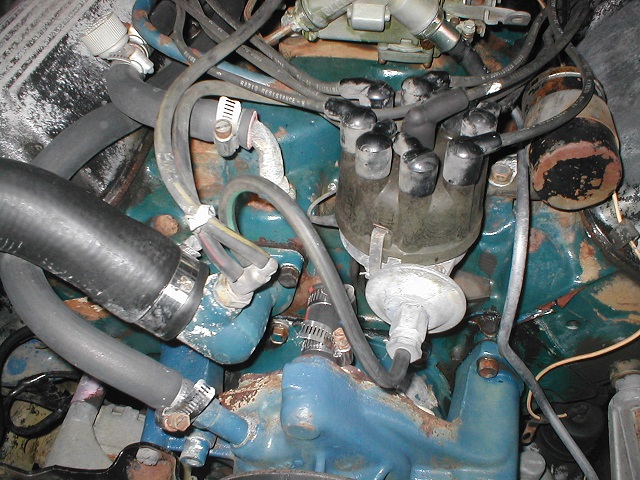 The GT500 KR distributor is usually marked C80F-12127-D. The automatic version will have a single pull vacuum advance. There are three colored vacuum lines. The original, green hose has a molded 90 degree bend.