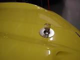 The stock Dzus hood pins were removed and a locking hood pin assembly was installed in its place. A small key is needed to unlock the hood. I have seen several cars from the dealership with this feature.