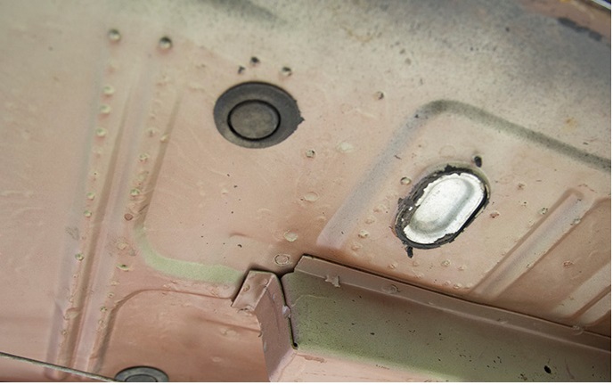 There are four oval floor drain covers visible from under the car. These were installed after the car was painted and sealed with rope caulk. The original finish is galvanized steel. They may also have a spray sealer on the inside of the car (under the carpet).