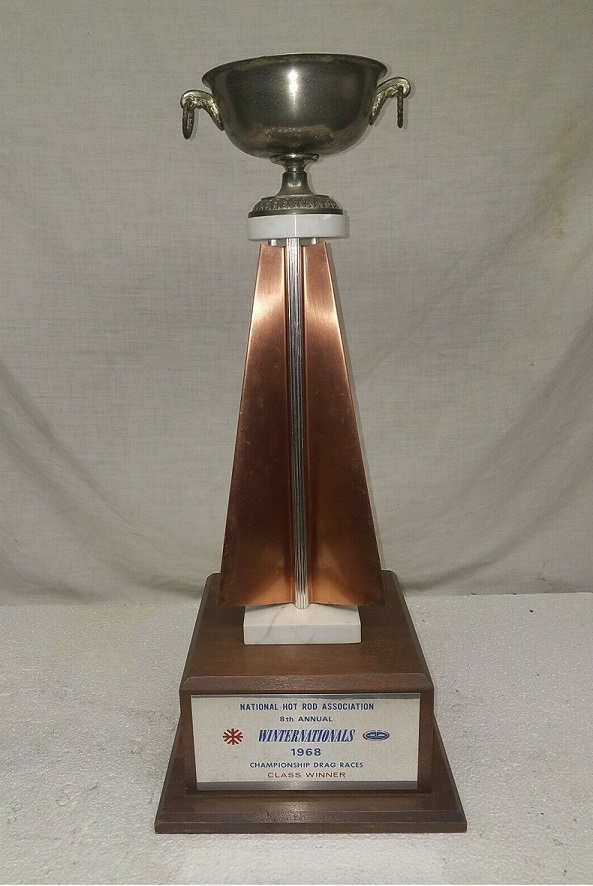 This trophy came from the 1968 Wintenational Drag Races in Pomona, California.