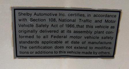 The first is the Shelby Certification label. This decal informs everyone that the vehicle conforms to the current safety standards.