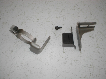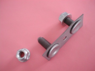 On the left is the pipe strap and u-bracket. Notice the pipe strap is narrow in the center and wider on the ends. A large phosphated, lag screw holds the clamp together.